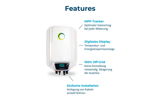 Der fotovoltaische Boiler bietet die ideale Lösung für eine kostengünstige und unabhängige Warmwasserversorgung. Einmal installiert produziert der Boiler über Jahre hinweg kostenloses heißes Wasser.